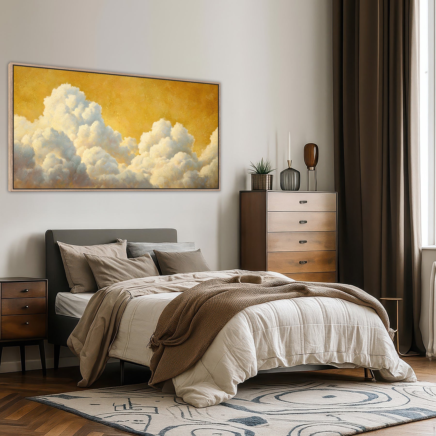 Panoramic extra large canvas art print featuring billowing white clouds against a golden sky. This dramatic cloudscape has warm golden tones throughout the piece and is ideal for lovers of large gold wall art decor or fans of cloud wall art themes.