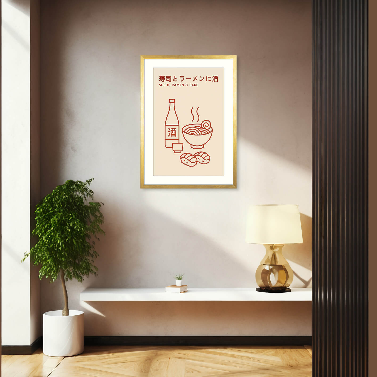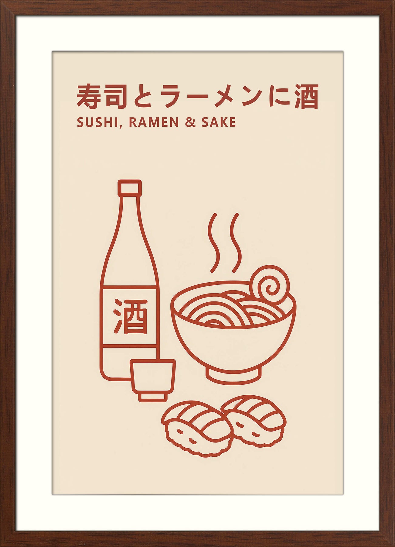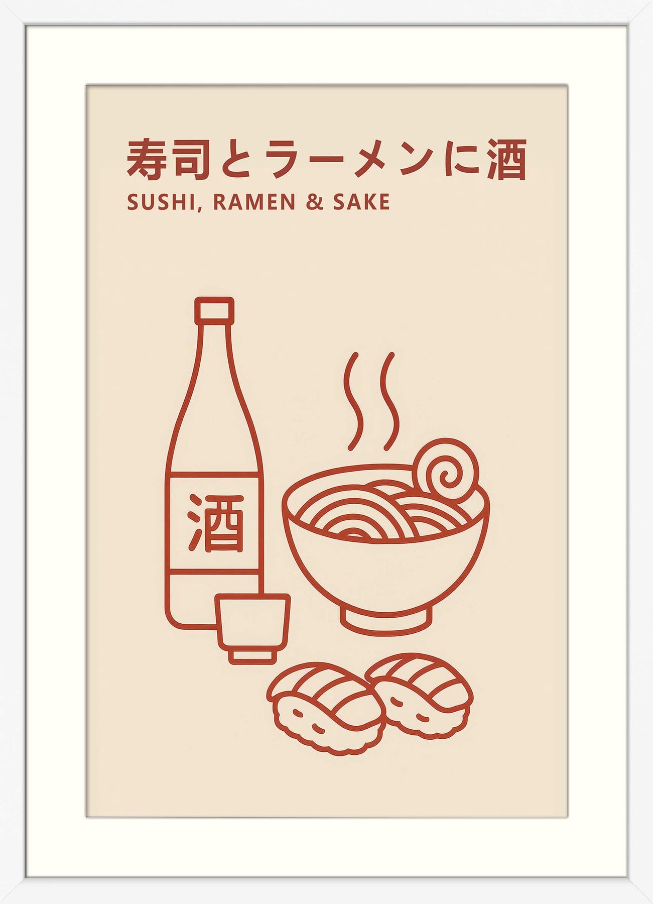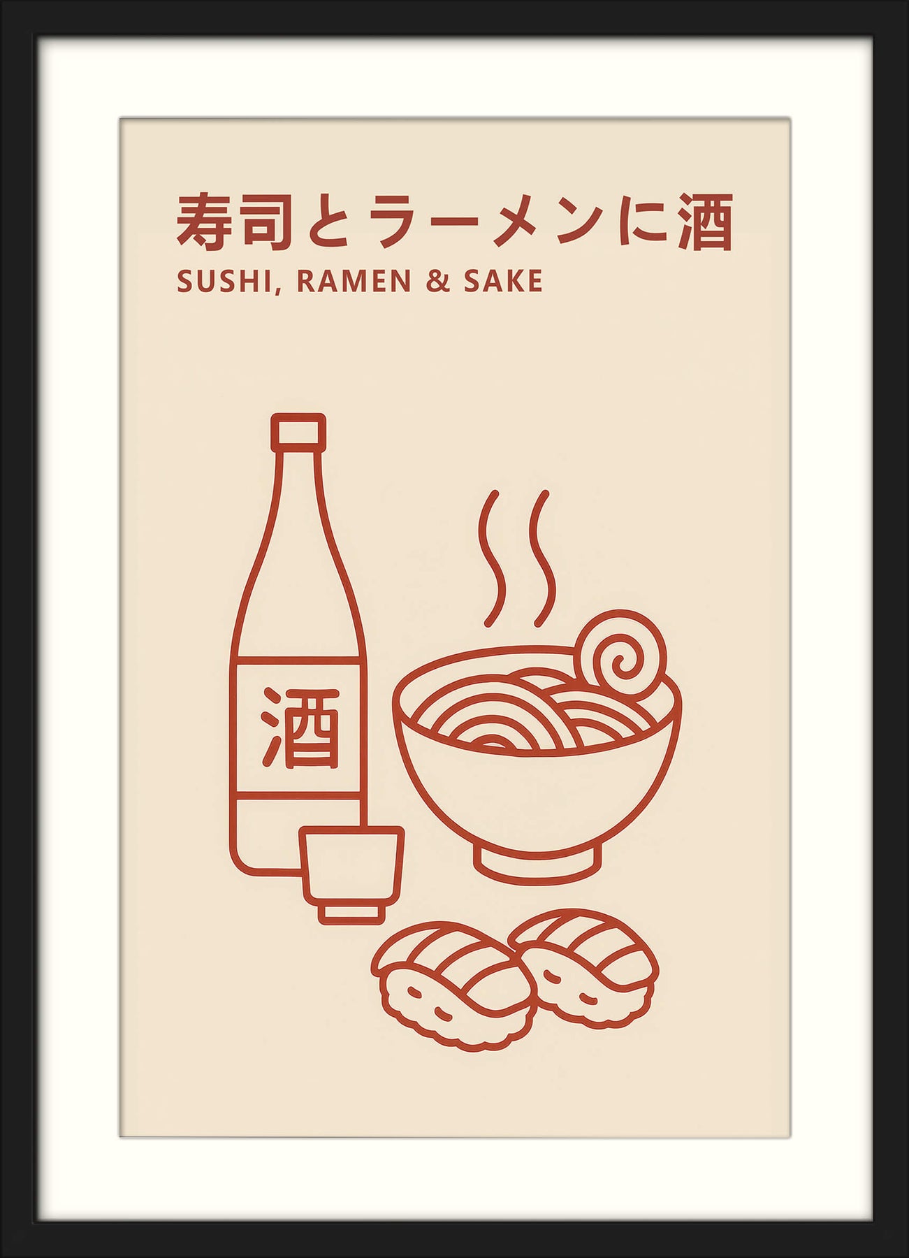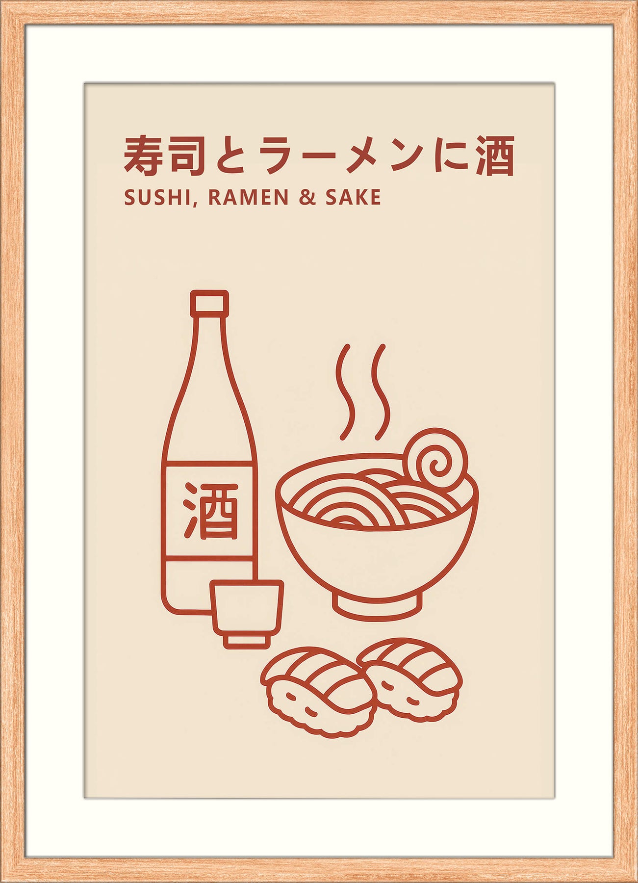 This minimalist giclée print showcases three iconic elements of Japanese cuisine—sushi, ramen, and sake—in a simple, modern line art style. The warm red illustration on a soft beige background creates a clean and balanced aesthetic that complements both contemporary and traditional spaces. With bilingual Japanese and English text, this artwork is a stylish nod to culinary culture and a perfect fit for dining areas, kitchens, or Japanese-themed interiors.