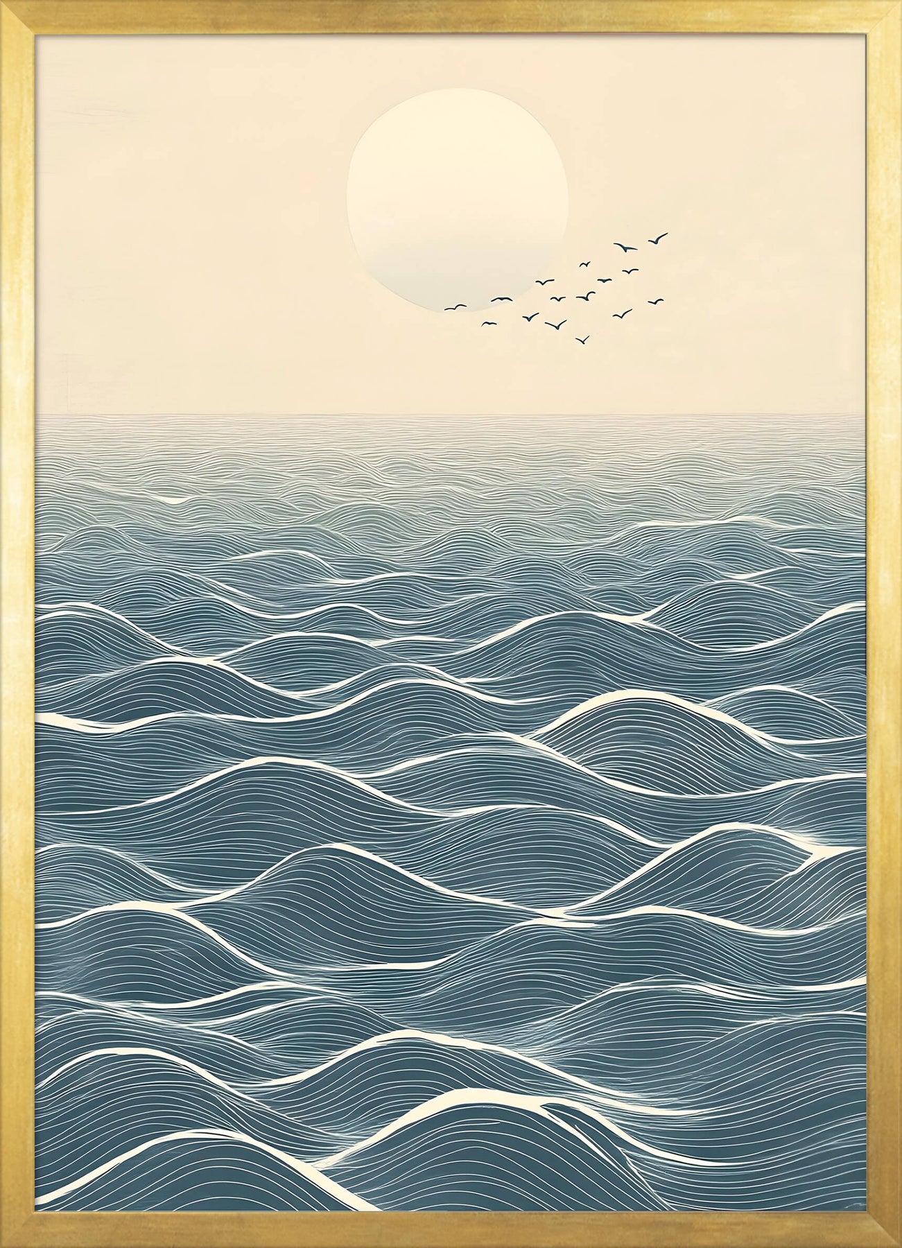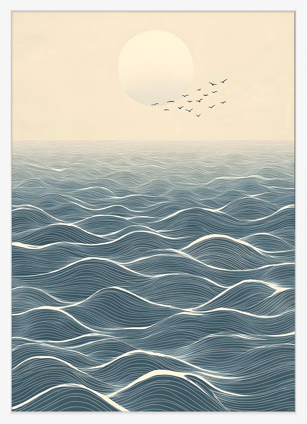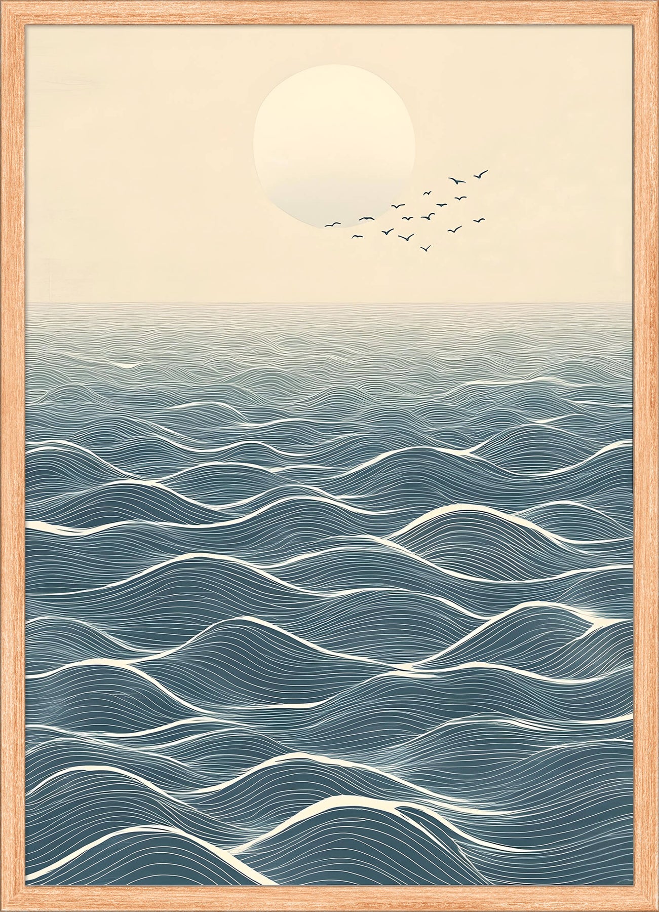 This tranquil Japanese wall art print captures the calm rhythm of the sea beneath a glowing full moon. Flowing white lines trace the curves of gentle waves across a deep blue ocean, gradually fading into a serene horizon. Above, a delicate flock of birds drifts across the sky, adding a sense of depth and movement to the minimalist composition. Blending traditional woodblock influences with a clean modern style, this giclée print is perfect for coastal interiors, Japandi spaces, or anyone drawn to the elegance of Japanese seascapes.