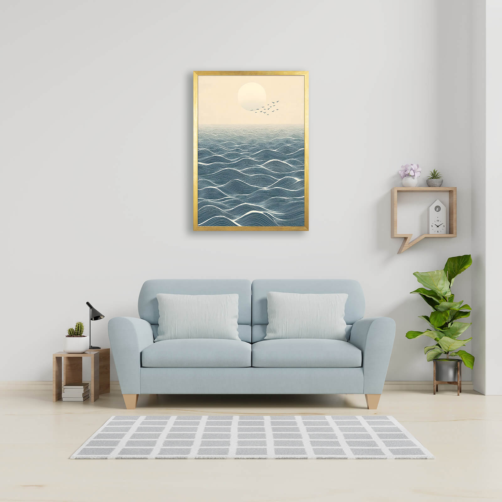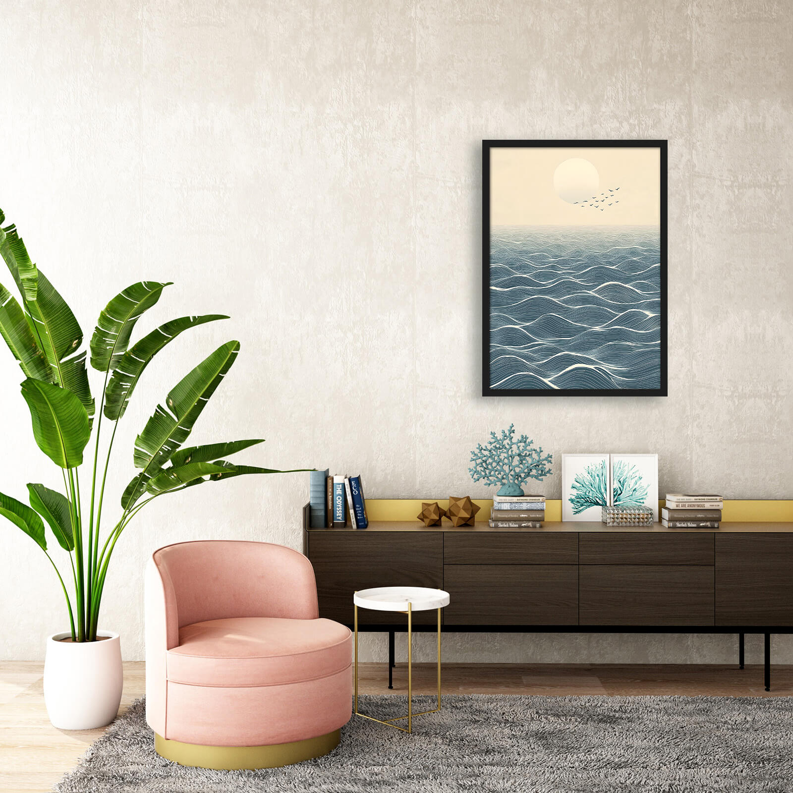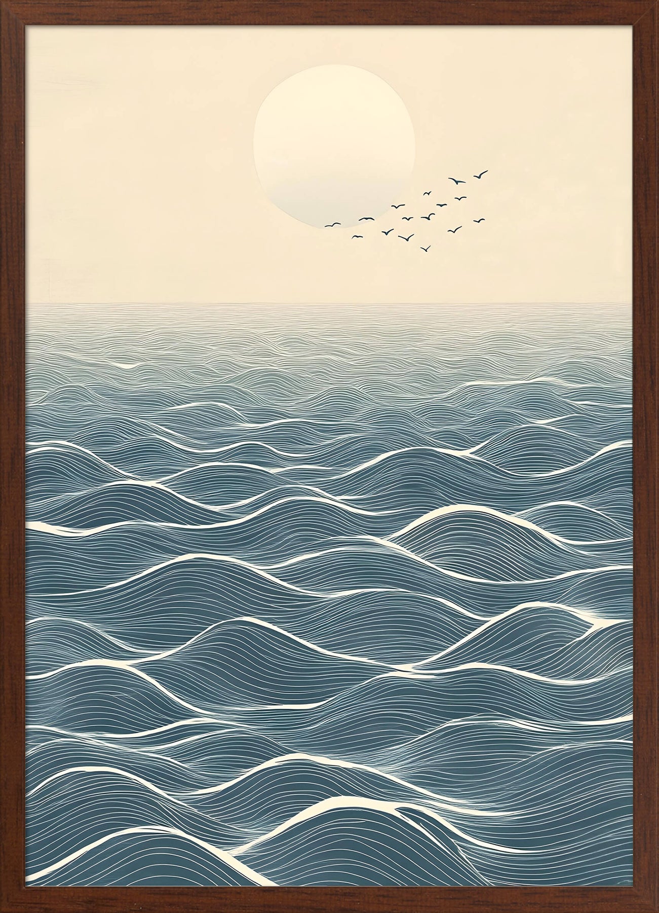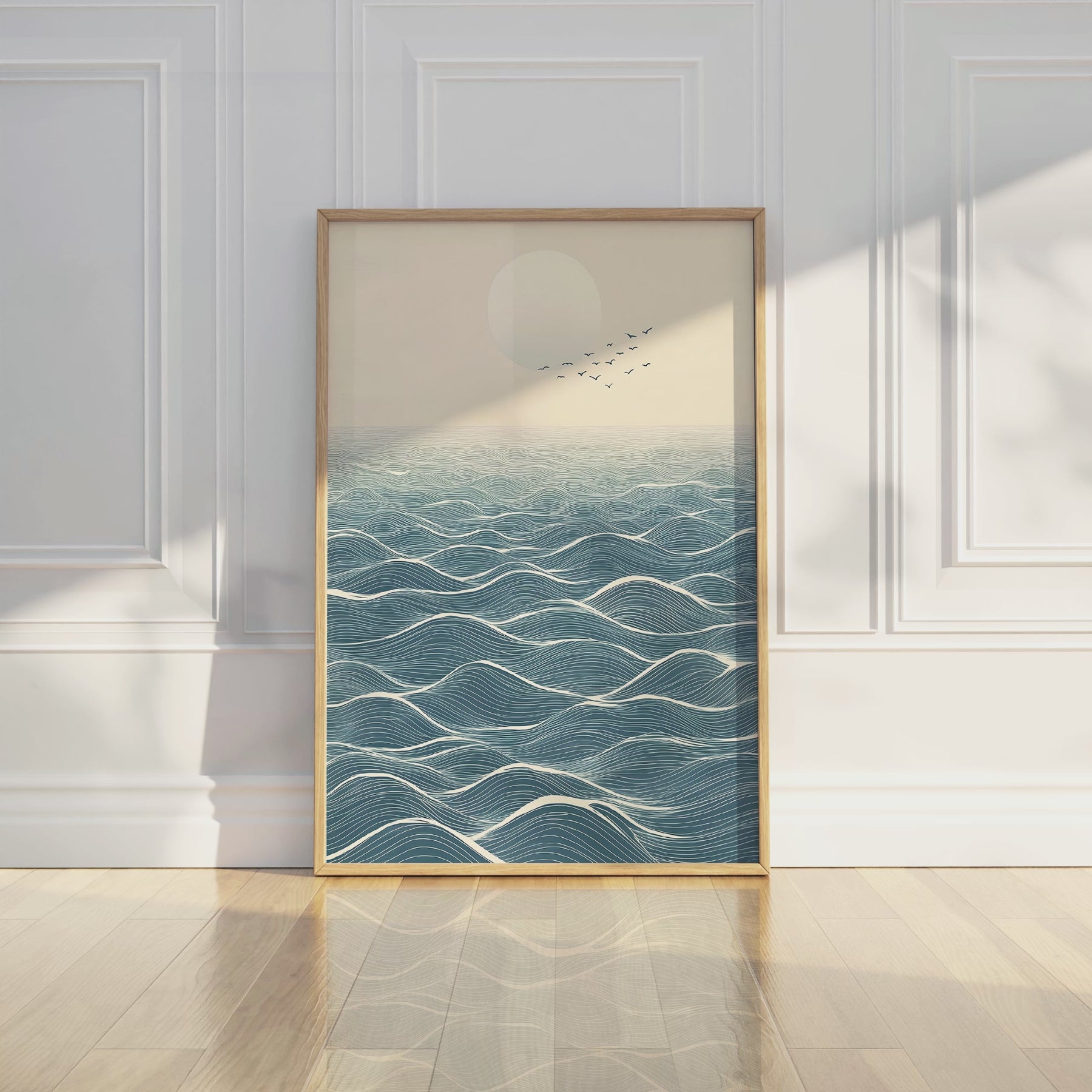 This tranquil Japanese wall art print captures the calm rhythm of the sea beneath a glowing full moon. Flowing white lines trace the curves of gentle waves across a deep blue ocean, gradually fading into a serene horizon. Above, a delicate flock of birds drifts across the sky, adding a sense of depth and movement to the minimalist composition. Blending traditional woodblock influences with a clean modern style, this giclée print is perfect for coastal interiors, Japandi spaces, or anyone drawn to the elegance of Japanese seascapes.