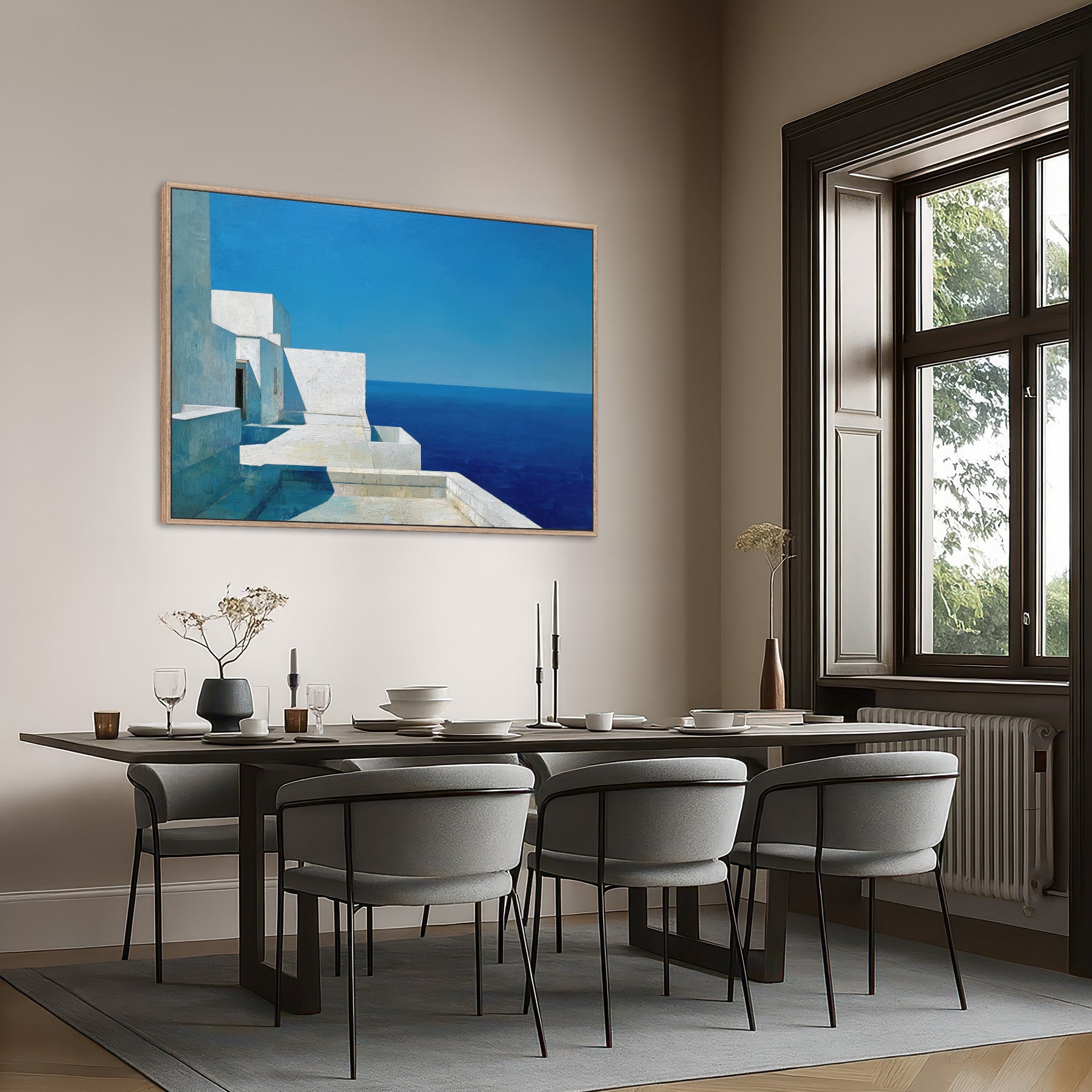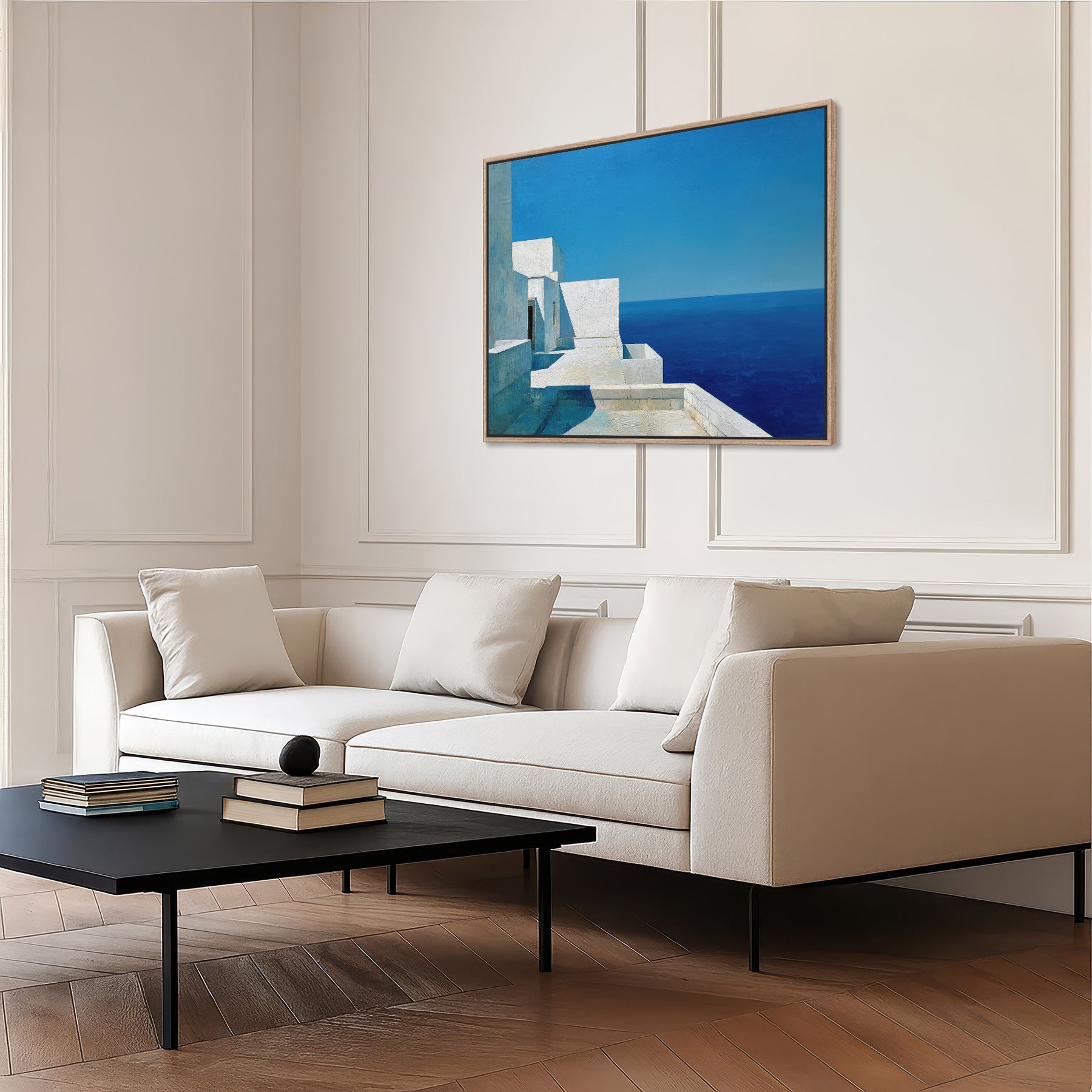 Large canvas art featuring geometric white buildings overlooking a vibrant blue ocean under a clear sky. Rendered in crisp white, soft turquoise, and rich shades of blue, this coastal architecture piece captures a serene Mediterranean scene with angular forms and minimalist design. The bold color contrast and contemporary composition make it perfect for living rooms, bedrooms, or modern spaces. Ideal for lovers of coastal wall decor themes, seascape art, and blue and white wall art.
