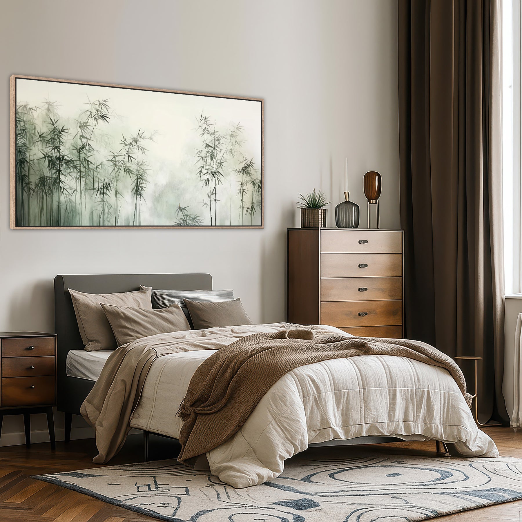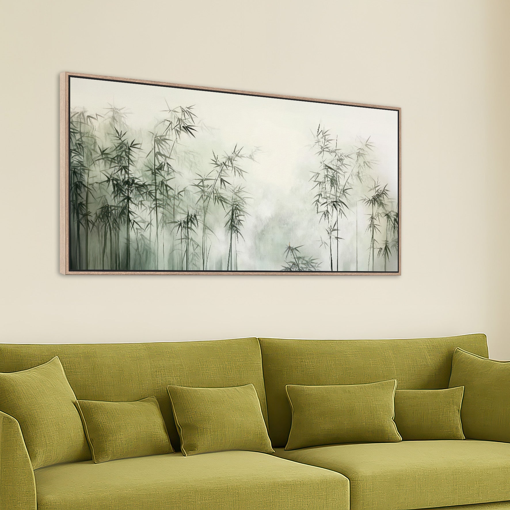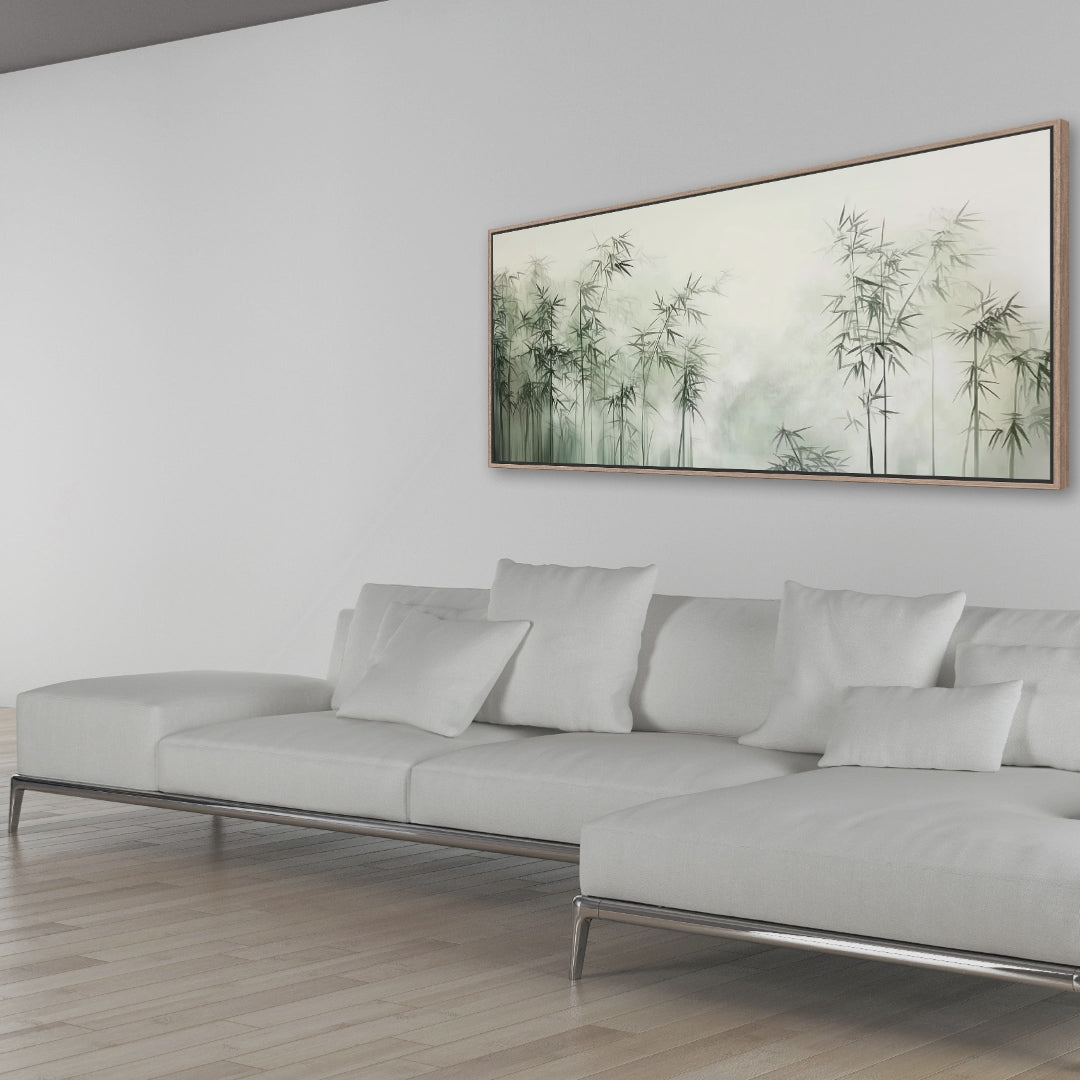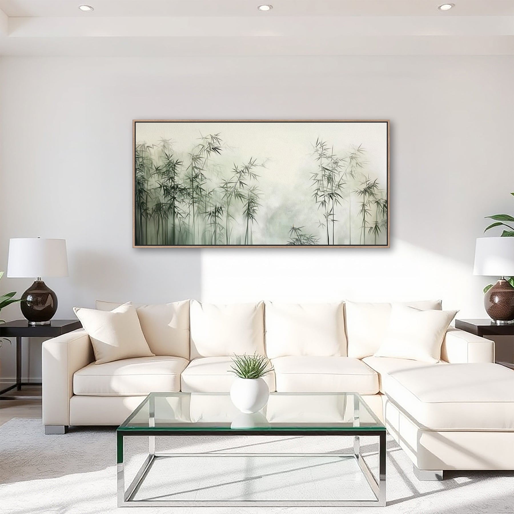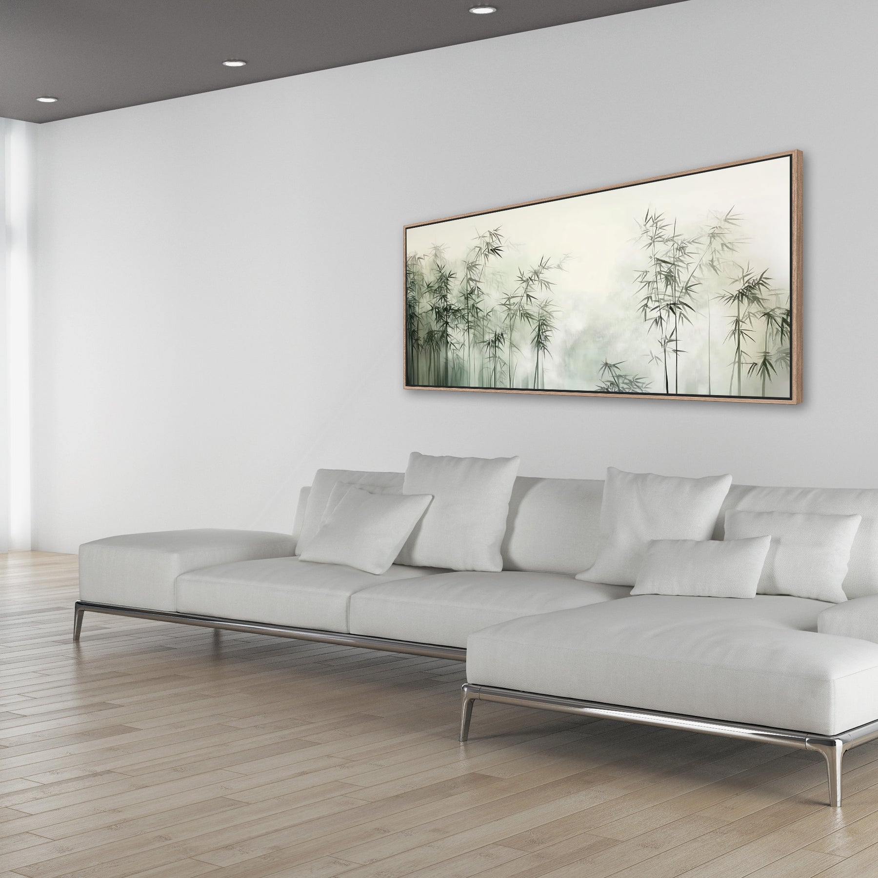 Extra large canvas art featuring a bamboo forest emerging from misty fog in soft green and gray tones. With its tranquil, minimalist aesthetic, this panoramic wall art creates a peaceful focal point perfect for living spaces, spas, and meditation rooms. A beautiful Zen wall decor piece for those who appreciate bamboo wall art themes and calming feng shui natural scenes.
