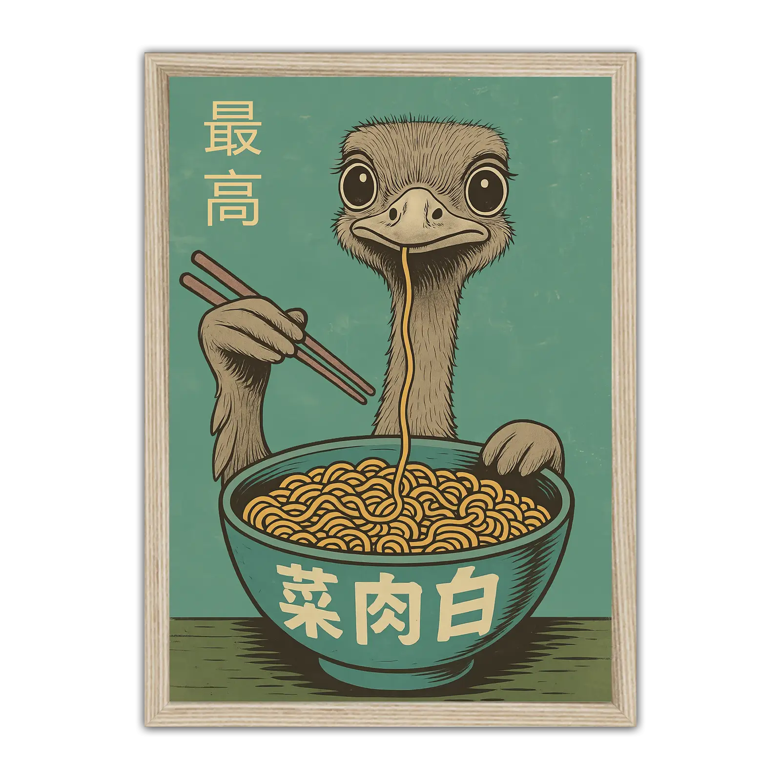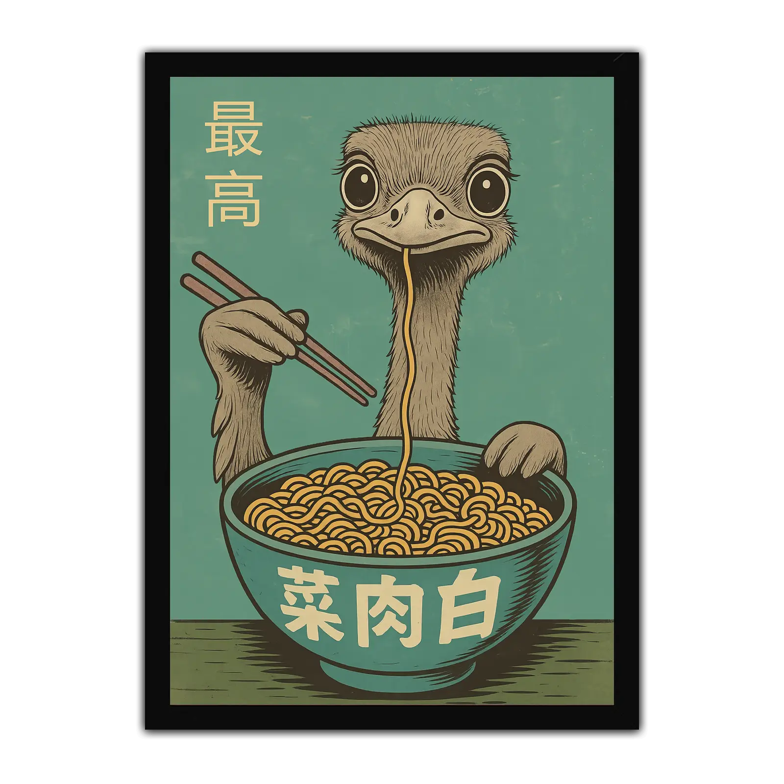 Add a dash of humour to your walls with this whimsical giclée art print featuring a wide-eyed ostrich slurping noodles from a giant bowl of ramen. Set against a bold teal background with retro-style Japanese text, this illustration combines vintage poster aesthetics with modern pop-art flair. Perfect for kitchens, dining spaces, or anywhere that needs a bit of light-hearted charm and conversation-starting energy.